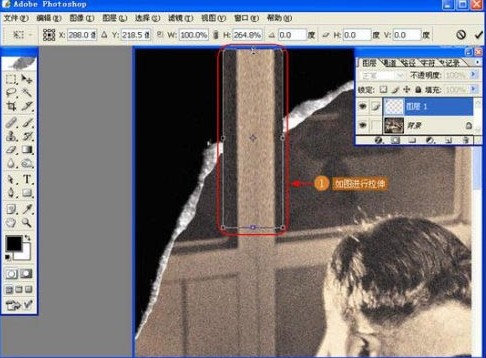 4、拉伸填补图像。在【自由变换】命令的基础上进行拉伸,填补残缺图像,如下图所示。